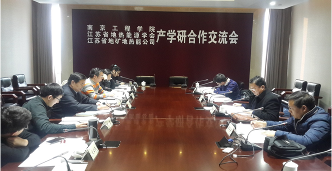 与江苏省地热能源学会、江苏省地矿地热能公司进行产学研合作交流,学院党委书记邓东华、副院长张君、暖通教研室主任陶爱荣和文先太博士参加交流会议,江苏省地热能源学会理事长杨增夫,秘书陶开宏,综合管理部长祝青、科宣部长史云杰、发展部长刘冰,江苏省地矿地热能有限公司副总经理刘加才、副总工程师李贵一同参加交流,会议由江苏省地矿地热能公司副总经理刘加才博士主持。