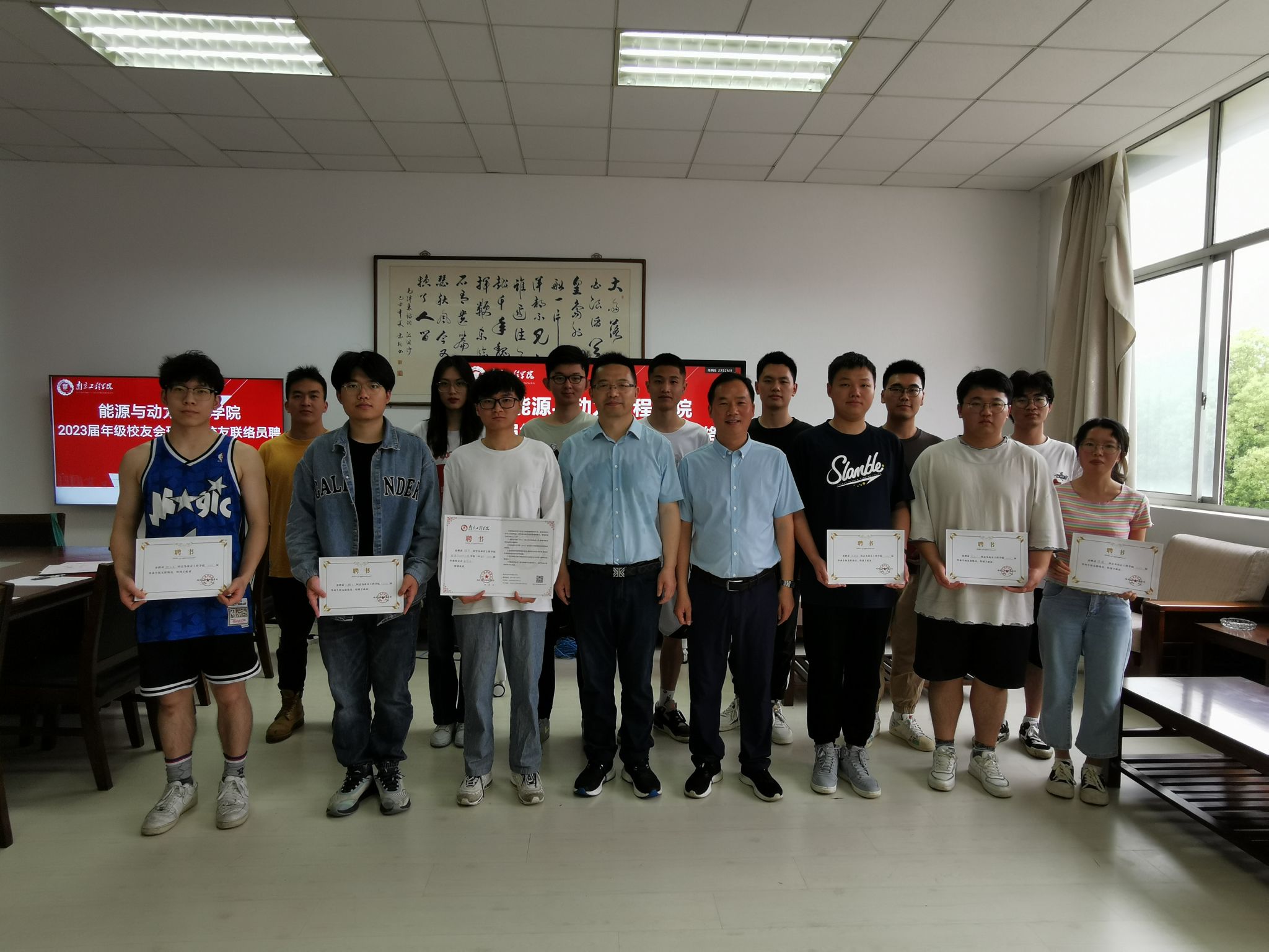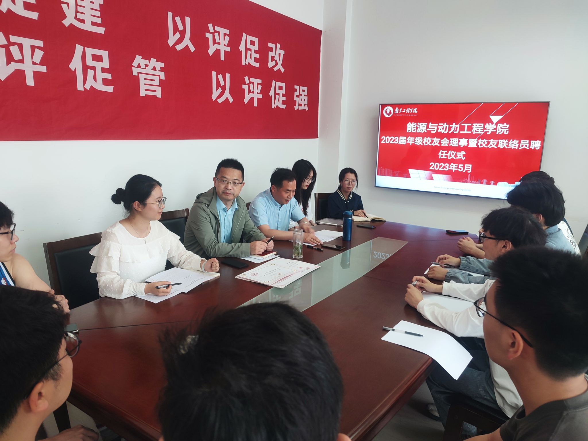 2023届毕业生年级校友会校友理事暨联络员的决定》。决定集控191班厉彦民担任2023届年级校友会会长,能动191徐宁担任副会长,集控191王泰淇担任秘书长,能动192强建军、核工程191徐振伟、新能源191陈政权等同学担任副秘书长、理事和联络员。接着,张书记为他们一一颁发聘书。最后,张书记简要回顾了学校及学院的办学历史,对在场的校友联络员提出了三点要求:一是要充分认识校友工作的重要意义。校友是学院的宝贵财富,是学院事业发展重要的依靠力量。学院高度重视校友工作,一直跟校友保持着密切的联系,也经常利用各种机会去看望校友。二是校友联络员要主动架起母校与校友间沟通联络的桥梁。及时把母校最新的发展动态传递给校友,同时也要把广大校友的所思所想所盼反馈给母校。三是希望大家常回母校看看。希望大家走上工作岗位后仍然要与母校保持密切联系,常回母校看看。母校也将永远是大家成长成才路上的坚强后盾。仪式结束后,学院校友秘书对获聘的校友理事和联络员进行了业务培训。学院还为他们赠送了精美的纪念品。