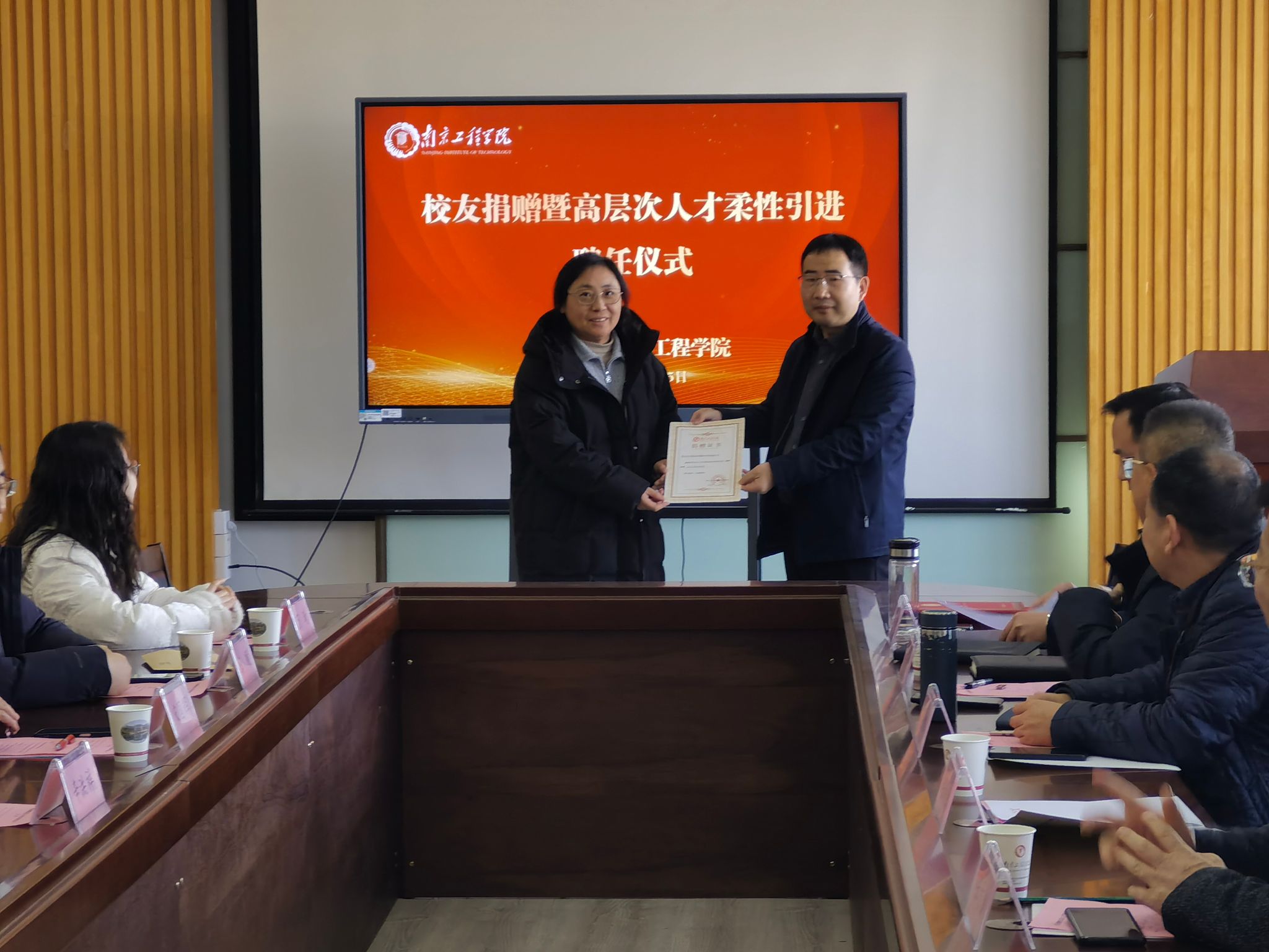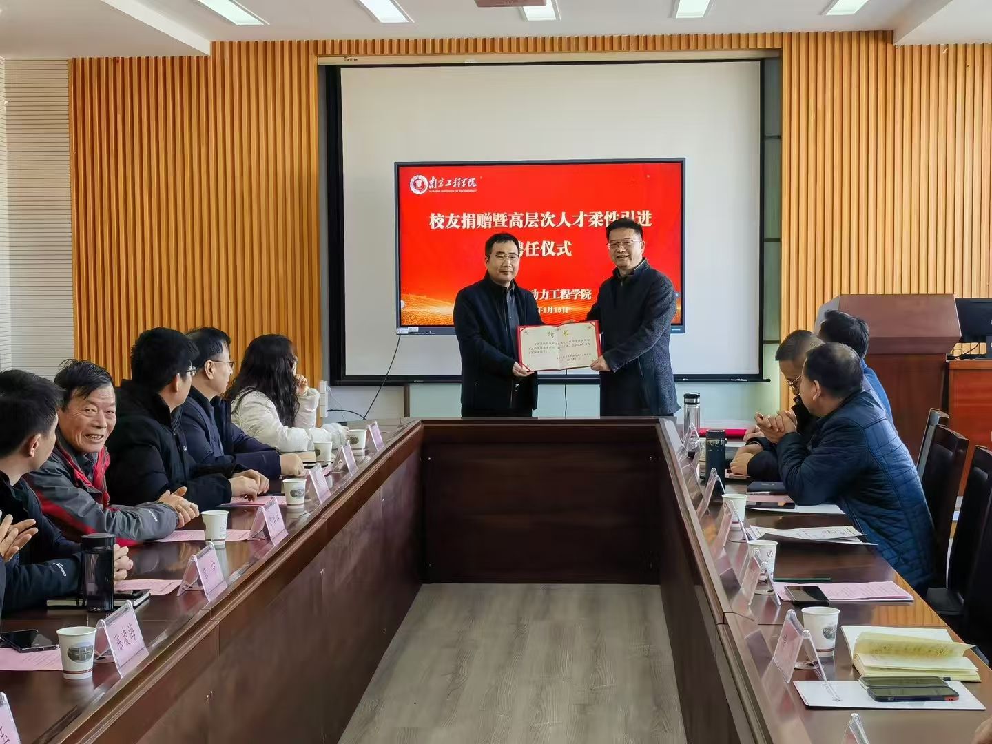 在至行苑·工程实践中心9-312会议室举行校友捐赠暨高层次人才柔性引进聘任仪式,徐州幻威动力智能科技有限公司总经理张向阳,学院新老班子成员、科级干部及各系办主任与会。