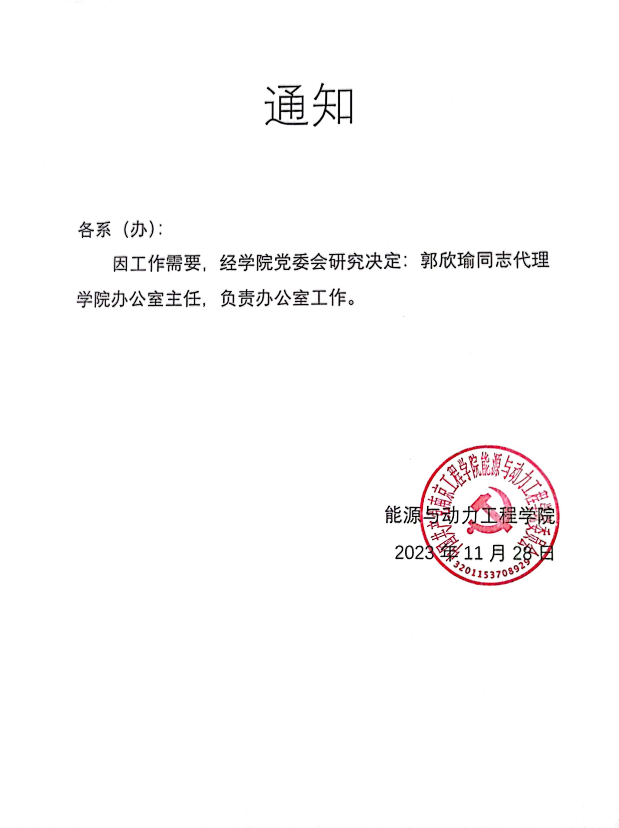 关于郭欣瑜同志代理办公室主任的通知