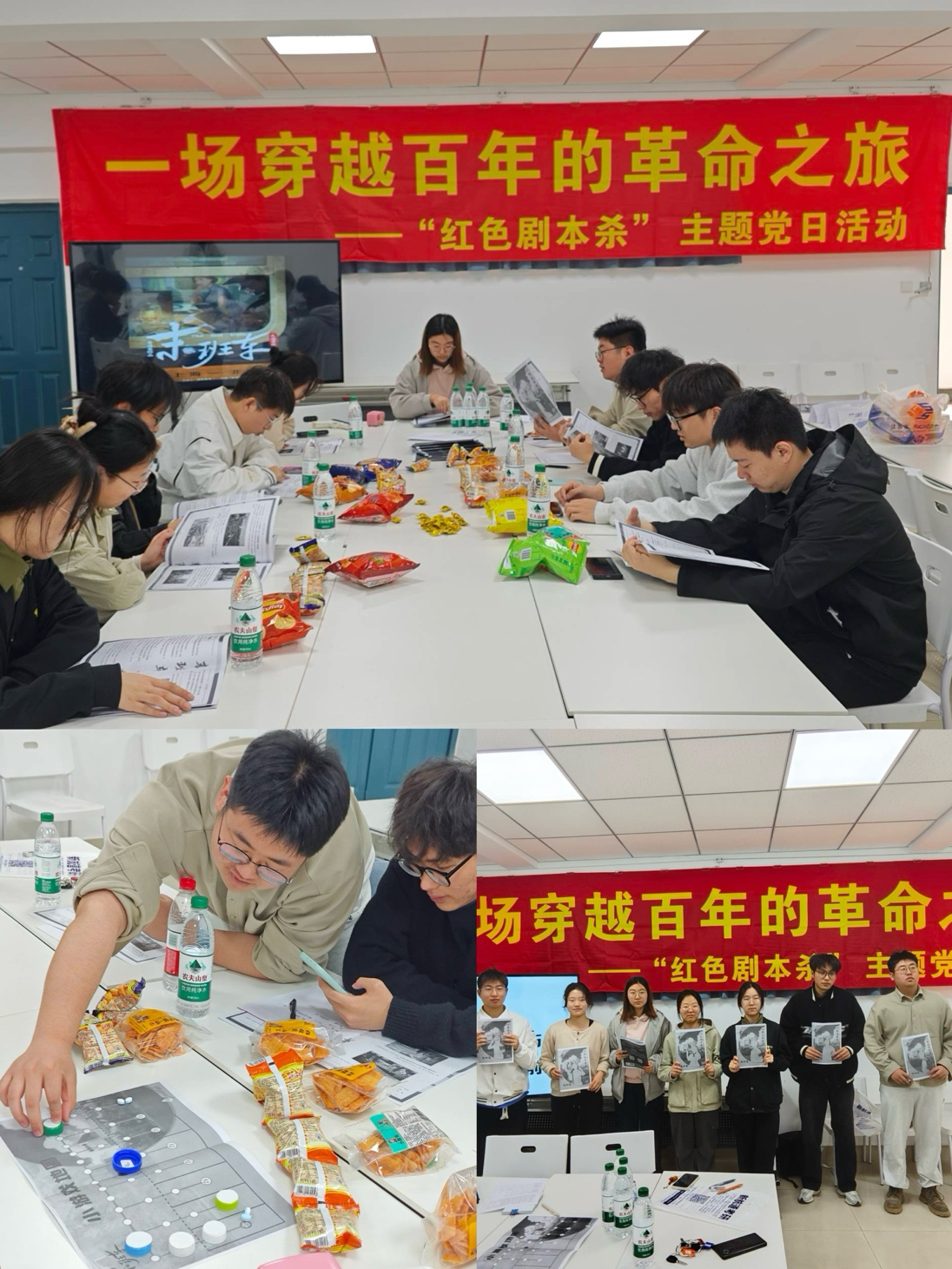 学生党支部在北四L202一站式学生社区,组织开展了以“一场穿越百年的革命之旅”为主题的红色剧本杀党日活动,通过沉浸式角色扮演、推理互动等形式,带领学生党员跨越时空对话革命先烈,在沉浸体验中感悟信仰力量。