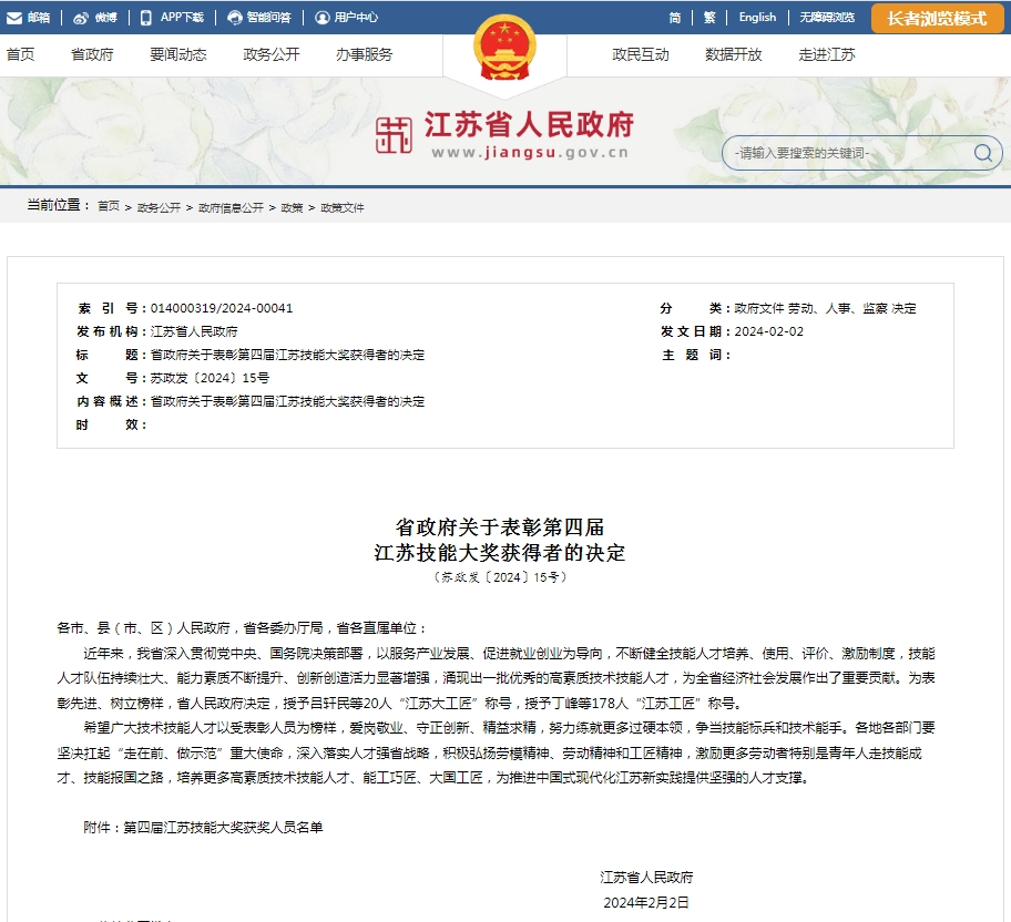 为表彰先进、树立榜样,近日,江苏省人民政府发布了《省政府关于表彰第四届江苏技能大奖获得者的决定》,成人文学