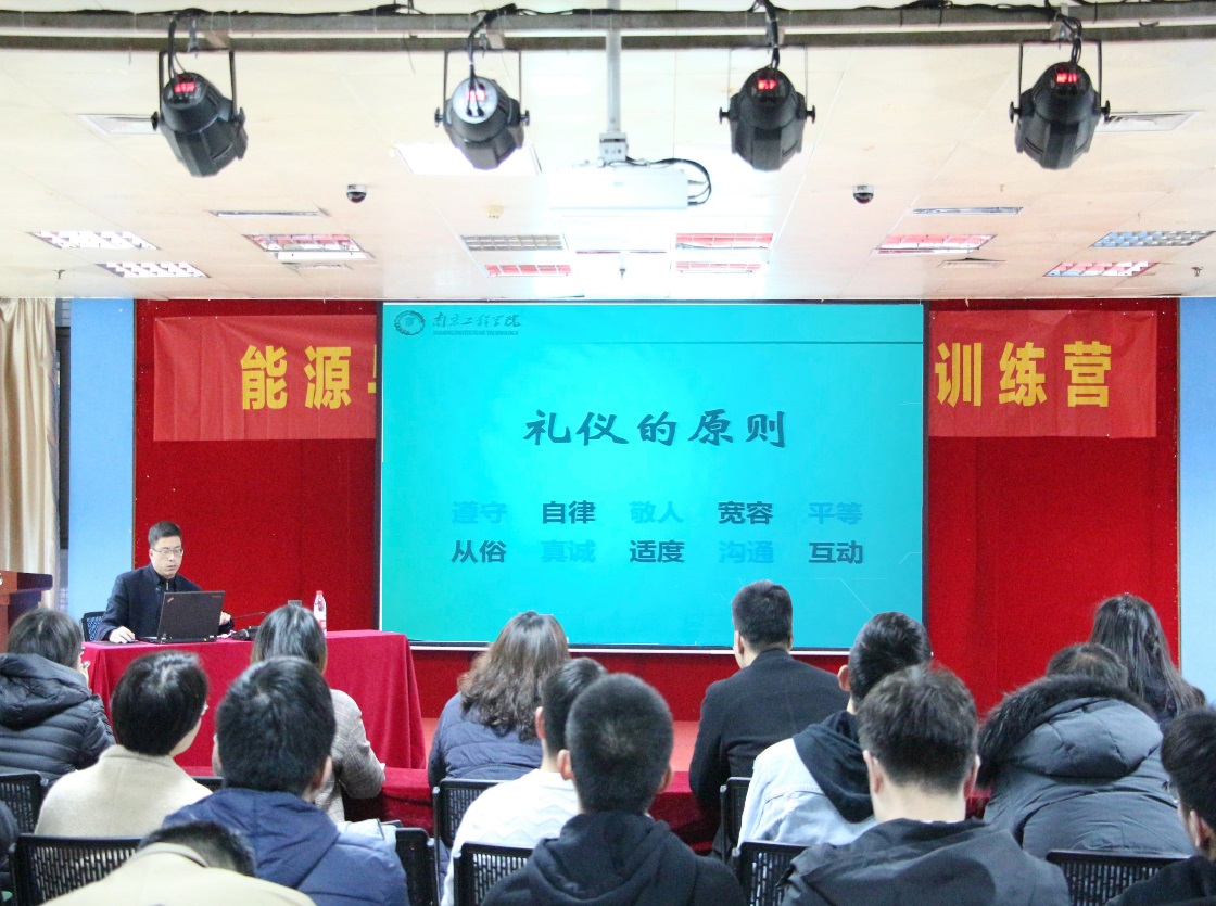 在东区大学生活动中心举办“礼仪漫谈”主题讲座。讲座由学院党委副书记陈培杰老师主讲,学工办老师、学生干部与全体大一新生聆听了讲座。