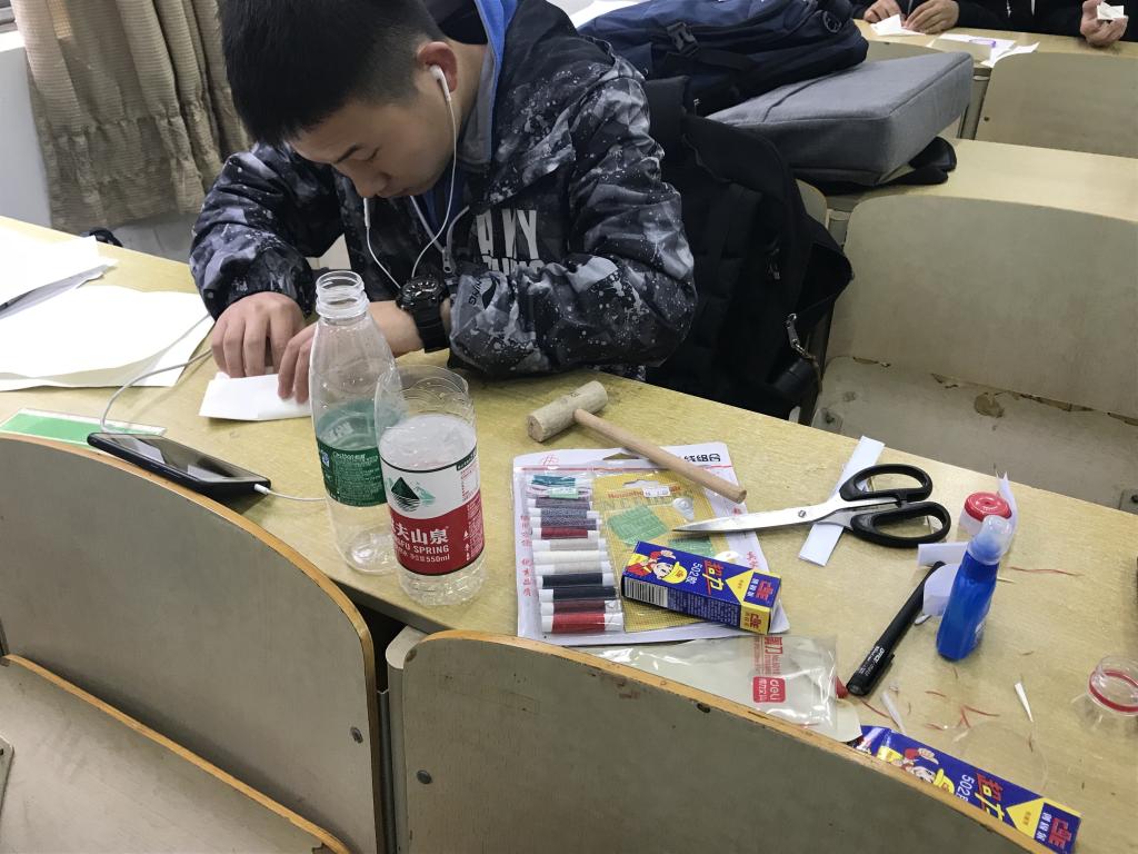 活动要求同学们运用自己的物理知识将纸张、牙签、木条、瓶盖等材料制作陀螺,通过2轮计时看谁制作的陀螺在桌子上转动的时间久为胜。活动现场,同学们以小组为单位,集思广益,制作出风格各异、创意十足的纸陀螺。最终的定点旋转环节更是吸引了同学们的围观,每个参赛作品的旋转、落地都伴随大家的阵阵惊呼。经过激烈角逐,来自热自181班杨帆、郜志杰、宋飞扬三人组获得比赛的第一名。