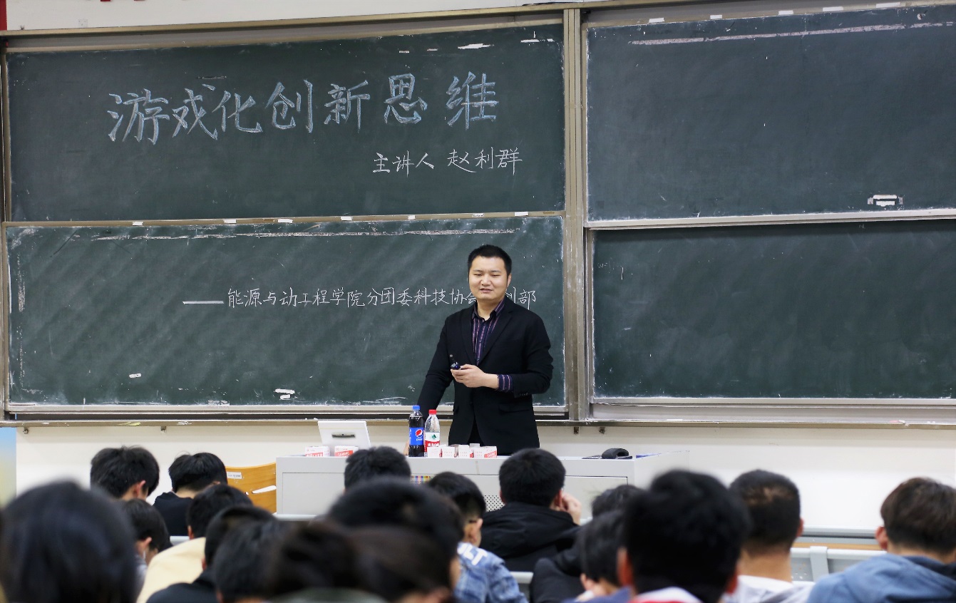 在东B201举办“游戏化创新思维设计”科技创新讲座。人文与社会科学学院赵利群老师就思维游戏化和创新设计解决问题与学生进行交流沟通。