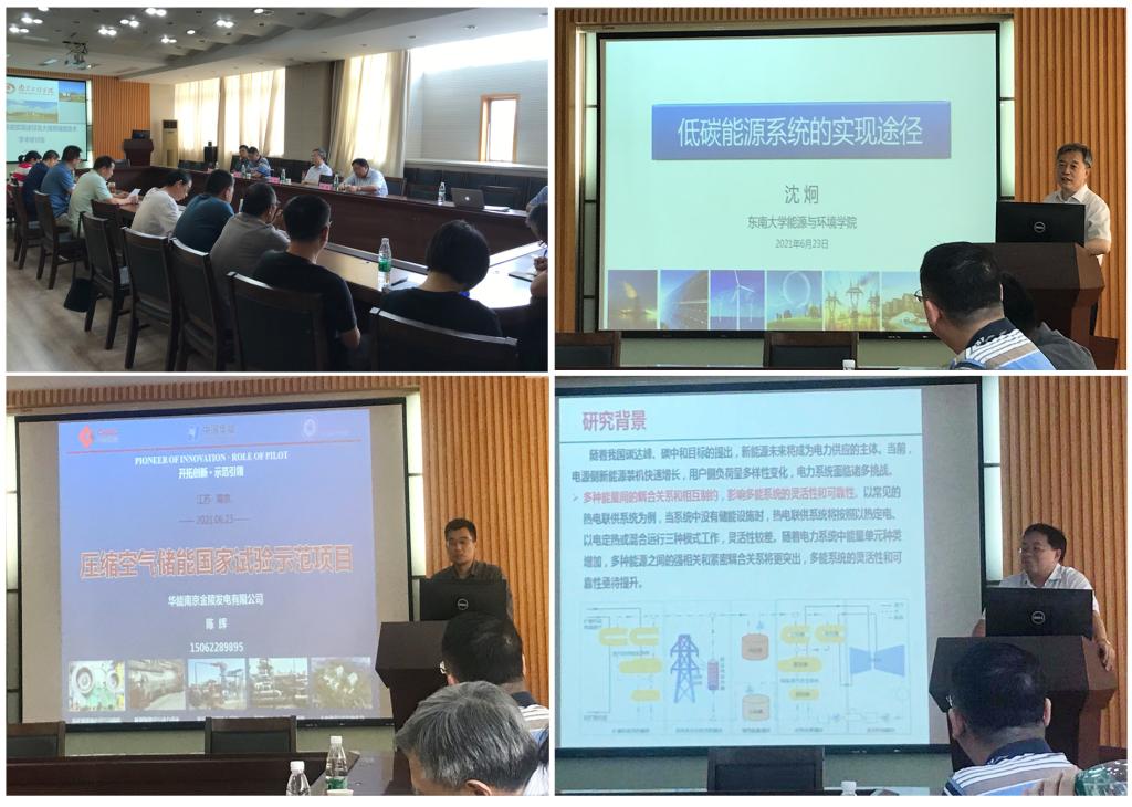 沈炯教授作了“低碳能源系统的实现途径”的学术报告,结合国家“碳达峰、碳中和”目标,分析当前碳排放具体情况,介绍低碳能源系统的实现途径。周昊教授作了“大规模热能储存技术”学术报告,介绍太阳能塔式熔盐发电原理、技术及系统运行,以及储热技术的发展趋势。陈辉高工作了“压缩空气储能国家试验示范项目”学术报告,介绍压缩空气储能技术的技术背景、技术发展历程、技术流派、盐穴压缩空气储能国家试验示范项目以及未来规划。专家们精彩的报告为在场老师奉献了一场精彩纷呈的学术盛宴。