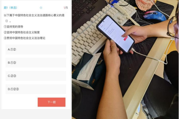 “将宪法宣誓制度写进宪法的是哪一个宪法修正案?答案是2018年宪法修正案。”来自集控211的王梦辉同学正在专心答题。学院组织学生在全国青少年普法网、“青少年普法”微信小程序上参与第七届全国学生“学宪法 讲宪法”专题活动,截至11月底,该院活动完成率达到95%,年级平均得分90.5分。