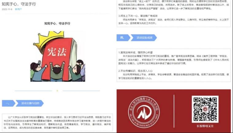 学院将结合学习宣传党的二十大精神和纪念现行宪法公布施行四十周年等内容,不断推进宪法学习宣传教育,弘扬宪法精神,维护宪法权威,继续营造学习宪法、尊崇宪法、维护宪法的浓厚氛围,创造“知法、懂法、守法、用法”的校园环境,助力大学生全面发展。