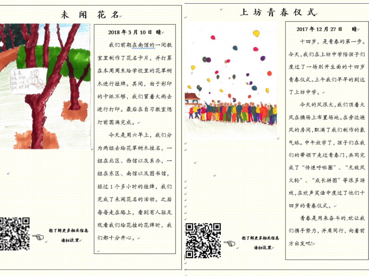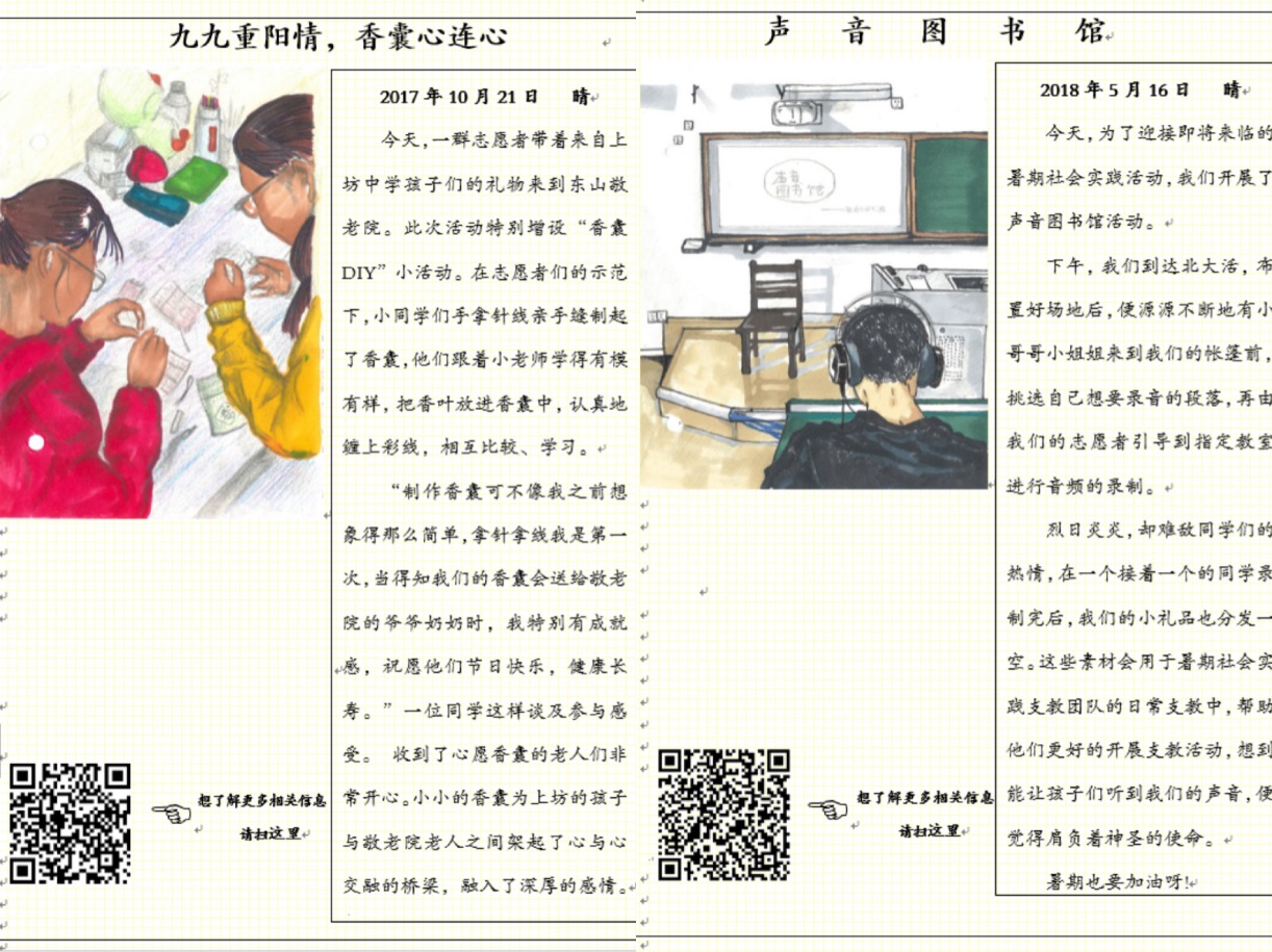 活动期间,志愿者们通过漫画与文字的形式,展现了过去两年能动学子在“十四岁青春仪式”、“入团第一课”、心愿支教、校园保洁等系列志愿服务活动中的精彩瞬间。一张张漫画,将最美的身影定格;一篇篇日记,将最真的善举珍藏。