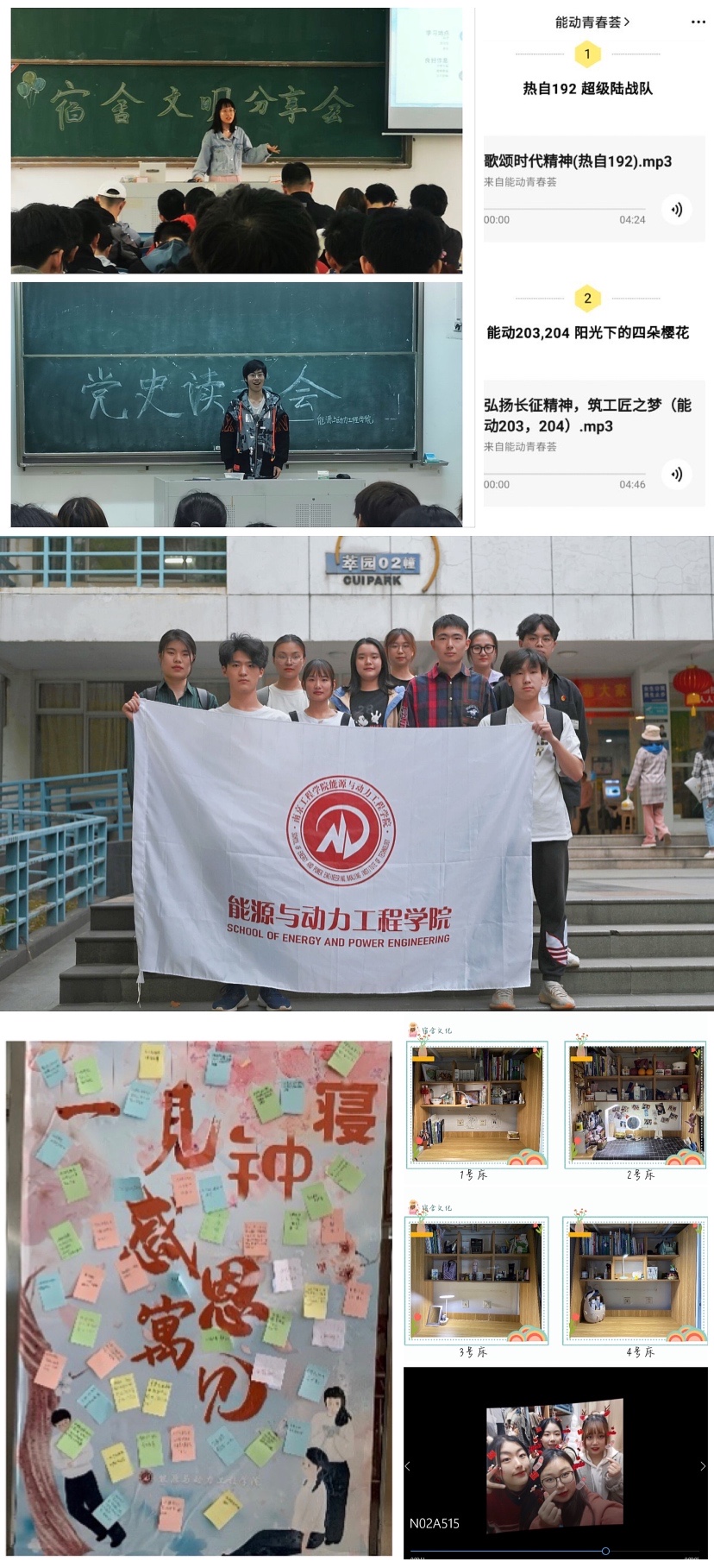 该院邀请“十佳优秀宿舍”代表、考取东南大学研究生的能动172李婉莹等同学走上讲台,向同学介绍宿舍成员在学业、科创、文化等方面的情况,展现先进宿舍群体的榜样力量,发挥朋辈教育引领作用,引导同学们形成“群策群力、百花齐放”的宿舍向心力。
